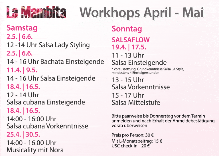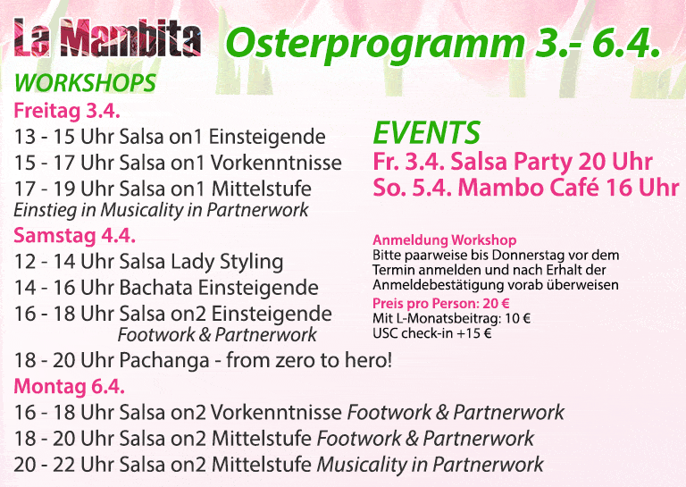 Durch jahrelange praktische Erfahrung haben wir ein gut strukturiertes Unterrichtskonzept entwickelt, das für jeden etwas bietet. Im La Mambita kannst Du Deine Freude am Tanzen entdecken, selbst wenn Du zum ersten Mal das Tanzparkett betrittst. Wir helfen jedem dabei, den richtigen Weg zu finden, Tanz in sein Leben zu integrieren und Teil der internationalen Tanzcommunity zu werden. Lass Dich von der Vielseitigkeit dieser Tänze begeistern, die Lebensfreude, Freude und Leidenschaft vereinen.